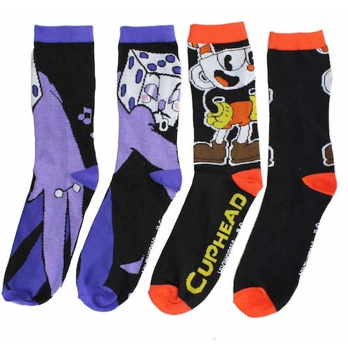 - O conjunto inclui meias vermelhas com Cuphead e meias azuis com King Dice.