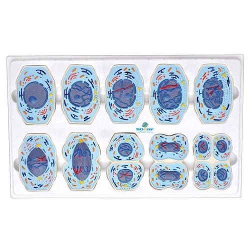 *1. Este modelo é apresentado em cores, facilitando a identificação e a identificação dos elementos celular ; Sua apresentação pode ser fixada em parede, pedestal ou até mesmo com seus 9 elementos separados em uma superfície; Com o modelo SD-5071 é possível identifica dentre outras estruturas: * 1. Interfase; * 2. Prófase; * 3. Pro Metáfase Inicial; * 4. Pro Metáfase Final; * 5. Metáfase; * 6. Anáfase Inicial; * 7. Anáfase Final, * 8. Telófase; * 9. Citocinese.