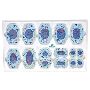 Modelo anatômico de mitose ilustra as 9 etapas da divisão celular de uma célula animal; Confeccionado em PVC; Está apresentada numa escala de aproximadamente 10.000: