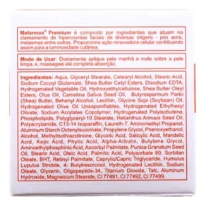 O Melannox Premium é um clareador desenvolvido para o cuidado diário da pele, com fórmula rica em ativos antioxidantes e hidratantes que contribuem para manter a pele com aspecto saudável, uniforme e com sensação de maciez. Sua textura leve e de rápida absorção promove conforto imediato, podendo ser utilizado em todos os tons de pele e em qualquer estação do ano.Benefícios e característicasClareadorSensação de hidratação prolongadaToque seco e confortávelAjuda a manter a aparência uniforme e revitalizadaTextura leveIndicado para todos os tipos e tons de pele.Princípios ativosWonderlight, Mandélico, Fítico, Kójico, Retinol, Mellan Complex, Nanocápsulas de Vitamina C, Albatin, Butylresorcinol, TGP-2 e Alfa-Arbutin.Modo de usarAplique diariamente pela manhã e à noite sobre a pele limpa e seca, massageando delicadamente até completa absorção. Durante o dia, utilize protetor solar.