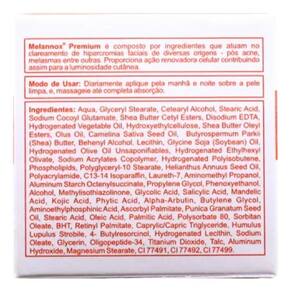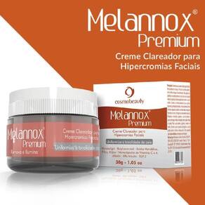 O Melannox Premium é um clareador desenvolvido para o cuidado diário da pele, com fórmula rica em ativos antioxidantes e hidratantes que contribuem para manter a pele com aspecto saudável, uniforme e com sensação de maciez. Sua textura leve e de rápida absorção promove conforto imediato, podendo ser utilizado em todos os tons de pele e em qualquer estação do ano.Benefícios e característicasClareadorSensação de hidratação prolongadaToque seco e confortávelAjuda a manter a aparência uniforme e revitalizadaTextura leveIndicado para todos os tipos e tons de pele.Princípios ativosWonderlight, Mandélico, Fítico, Kójico, Retinol, Mellan Complex, Nanocápsulas de Vitamina C, Albatin, Butylresorcinol, TGP-2 e Alfa-Arbutin.Modo de usarAplique diariamente pela manhã e à noite sobre a pele limpa e seca, massageando delicadamente até completa absorção. Durante o dia, utilize protetor solar.