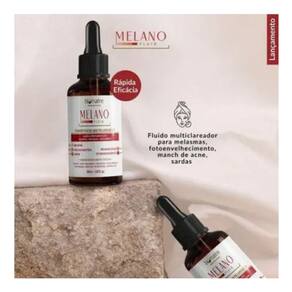 Melano Fluid é um fluido clareador de uso diário, desenvolvido para auxiliar no cuidado completo da pele. Sua fórmula avançada combina ativos que promovem sensação de hidratação prolongada, suavidade e luminosidade, deixando a pele com aparência uniforme e radiante. Textura leve e rápida absorção, indicado para todos os tipos de pele e para uso em qualquer época do ano.Benefícios e característicasSensação de pele hidratada e com textura uniformeClareadorToque confortávelAção antioxidanteTextura leve de rápida absorçãoIndicado para uso diárioLivre de parabenosPrincípios ativosÁcido Tranexâmico, PHE Resorcinol, Bakuchiol, Vitamina C 35, Ácido Ferúlico, Niacinamida, Ácido Kójico e Caviar.Modo de usarPela manhã e à noite, com a pele limpa e seca, aplique o fluido sobre toda a face e espalhe até completa absorção. Não remover. Durante o dia, utilize protetor solar.