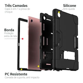 A capa Anti-shock é perfeita para o tablet das crianças, com uma tecnologia de três camadas que absorvem e amenizam o impacto, garantindo proteção contra quedas e arranhões. As bordas da capa tem reforço anti-impacto, principalmente na região da frente, que fica parcialmente coberta contribuindo para a proteção extra da tela do aparelho. Na parte traseira, uma borda no lado da câmera e no leitor de digital impede o contato dos sensores com o chão caso ocorra uma queda. Também com um apoio para posicionar o tablet da forma horizontal e vertical, facilitando o uso.