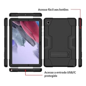 Especificação Técnica da Capa: Pode ser utilizada como capa sem o suporte ou com o suporte na posição paisagem Leve, resistente e fácil de transportar Design inteligente permite ligar o seu carregador, cabo ou fone de ouvido sem remover a case Com 3 camadas de encaixe para proteger o seu tablet com acabamento emborrachado Confeccionada em plástico e borracha de alta qualidade com excelente acabamento Abertura para botões, abertura para fones, carregador, câmera Protege contra choques, quedas e arranhões