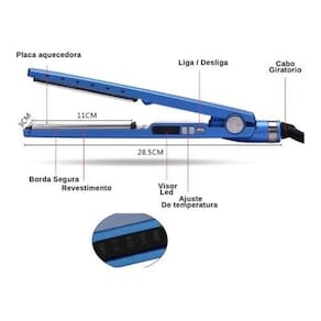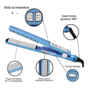 Prancha com design moderno, placas em titânio ideal para processos químicos. Suportam temperaturas muito altas e ajudam a manter a umidade natural do cabelo e proporcionar mais brilho.