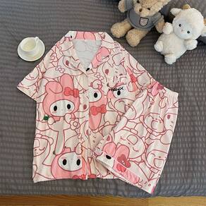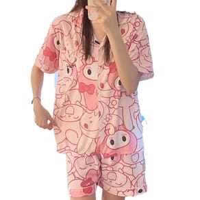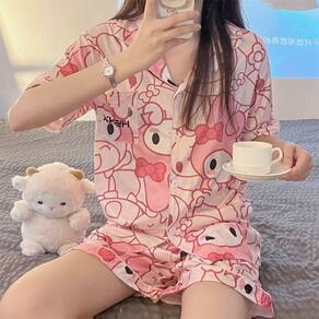 Pijama de primavera/verão com a adorável estampa Melody! Adicione frescor às suas noites quentes • Composição principal do tecido: fibra de poliéster • Tipo de gola: lapela • Função: lazer, respirável, para dormir, elástica, caseira, confortável • Estação adequada: verão, primavera • Estilo: desenho animado