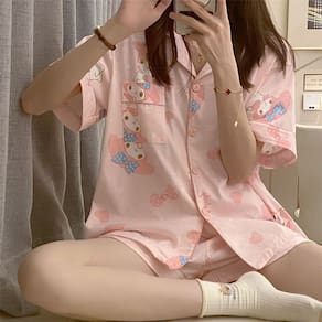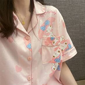 Pijama de primavera/verão com a adorável estampa Melody! Adicione frescor às suas noites quentes • Composição principal do tecido: fibra de poliéster • Tipo de gola: lapela • Função: lazer, respirável, para dormir, elástica, caseira, confortável • Estação adequada: verão, primavera • Estilo: desenho animado