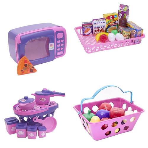 O kit vem com microondas com acessório, mercadinho com frutinhas, legumes e comidinhas, jogo de panelas com cestinha e potinhos de mantimentos