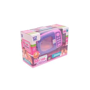 O kit vem com microondas com acessório, mercadinho com frutinhas, legumes e comidinhas, jogo de panelas com cestinha e potinhos de mantimentos, escorredor com louça