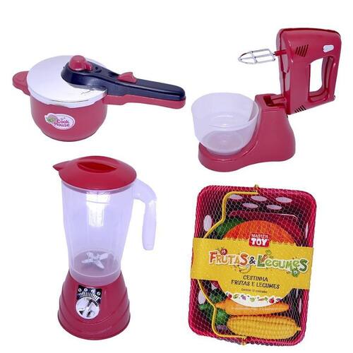 O kit vem com liquidificador, batedeira, panela de pressão, mercadinho com frutas e legumes
