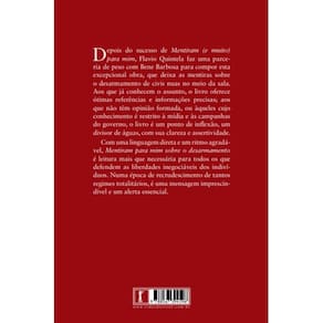 Depois do sucesso de Mentiram (e muito) para mim, Flavio Quintela faz uma parceria de peso com Bene Barbosa para compor esta excepcional obra, que deixa as mentiras sobre o desarmamento de civis nuas no meio da sala. Aos que já conhecem o assunto, o livro oferece ótimas referências e informações precisas aos que não têm opinião formada, ou àqueles cujo conhecimento é restrito à mídia e às campanhas do governo, o livro é um ponto de inflexão, um divisor de águas, com sua clareza e assertividade. Com uma linguagem direta e um ritmo agradável, Mentiram para mim sobre o desarmamento é leitura mais que necessária para todos os que defendem as liberdades inegociáveis dos indivíduos. Numa época de recrudescimento de tantos regimes totalitários, é uma mensagem imprescindível e um alerta essencial.