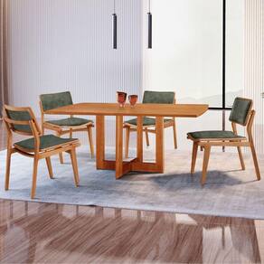 As cadeiras Eva complementam perfeitamente esse conjunto, trazendo um toque ainda mais natural e aconchegante. Feitas em madeira macica e cuidadosamente estofadas no assento e encosto, oferecem o equilibrio ideal entre conforto e design. Seu formato envolvente acolhe de forma unica, criando o ambiente perfeito para momentos inesqueciveis ao redor da mesa.