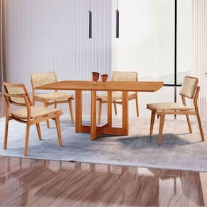 As cadeiras Eva complementam perfeitamente esse conjunto, trazendo um toque ainda mais natural e aconchegante. Feitas em madeira macica e cuidadosamente estofadas no assento e encosto, oferecem o equilibrio ideal entre conforto e design. Seu formato envolvente acolhe de forma unica, criando o ambiente perfeito para momentos inesqueciveis ao redor da mesa.