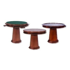 Mesa para Carteado Redonda TE6. Altura: 0,80cm Diâmetro: 1,00cm Opções de Madeira: Clara ou Escura Outras opções a consultar Opções de Tecido: Verde/Azul/Vinho/Vermelho/Preto Mesa de carteado que ao virar o tampo se torna uma mesa comum, e ao removê-lo, uma mesa de xadrez