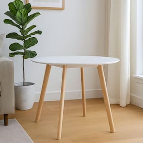 A mesa Leda redonda conta com tampo de MDF de alta resistência, acabamento refinado e base robusta em madeira, garantindo durabilidade e charme.