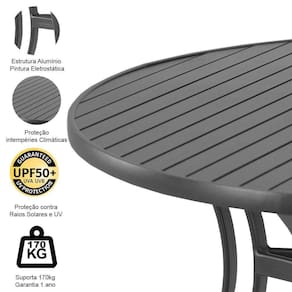 CARACTERISTICAS: - A mesa acompanha a pintura eletrostatica, e a estrutura e em aluminio. - - As cores dos produtos podem variar de acordo com o ambiente e com a iluminacao em que as fotos foram tiradas. - Tampo ripado em aluminio.