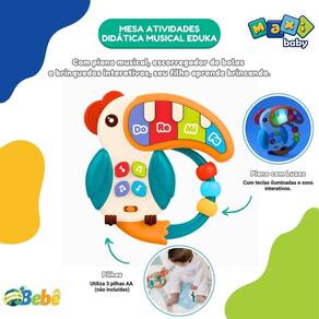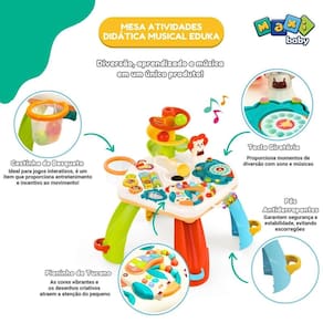 Mesa Atividades Infantil Didática Musical Eduka - Maxi Baby Se você está em busca de uma mesa de atividades educativas para crianças a partir de 18 meses, esta mesa interativa e colorida é a escolha ideal para o seu pequeno. Com um design envolvente e cheio de opções de brincadeiras, ela traz um escorregador de bolas, um piano Tucano musical, um cesto de bolas removível, um mostrador telefônico com números, além de diversos brinquedos manipulativos, como um chocalho giratório e contas de dedo. Tudo isso foi desenvolvido para estimular o desenvolvimento de habilidades motoras finas, coordenação olho-mão e capacidades cognitivas, como o entendimento de causa e efeito e a percepção espacial. A mesa inclui um piano musical tipo tucano que oferece diferentes modos de som e música, como melodias agradáveis e o modo Do Re Mi Fa. Ao pressionar os botões, seu pequenopoderá explorar novos sons e ritmos, aprimorando sua audição e a coordenação entre mãos e olhos. O escorregador de bolas é outra característica divertida, permitindo que a criança solte as bolas coloridas e observe o movimento delas, incentivando a experimentação e o desenvolvimento do raciocínio lógico. Além disso, há diversos brinquedos manipulativos, como um chocalho giratório com bolas coloridas e contas móveis, que ajudam a exercitar a motricidade fina e a percepção visual. A mesa é leve e de fácil manuseio, com 46 cm de altura e 46 cm de largura, sendo ideal para crianças a partir de 18 meses. Ela vem com três bolas coloridas e é feita de plástico resistente, com recursos interativos que incluem sons, melodias e luzes, tornando a experiência de brincar ainda mais envolvente e divertida para o seu pequeno. Principais Características: - Idade Recomendada: A Partir dos 18 meses - Efeitos sonoros - Efeitos de Iluminação - Utiliza 3 pilhas AA não incluídas - Piano de Tucano - Labirinto - Engrenagens - Cesta de basquete - Design durável e seguro: A Mesa Eduka da Maxi Baby é projetada com segurança em mente, atendendo aos padrões internacionais com certificações EN71 e ASTM, garantindi um ambiente seguro e saudável para o seu pequeno aprender e brincar. - Experiência de Aprendizagem Multifuncional: Esta mesa de atividades do bebê oferece uma experiência de aprendizagem abrangente, proporcionando um ambiente moderno e envolvente para as crianças explorarem e desenvolverem suas habilidades cognitivas. - Fácil montar e transportar: O projeto moderno e o tamanho compacto do produto fazem fácil montar e transportar, aperfeiçoam para o uso na pré-escola, no jardim de infância, ou mesmo em casa, conforme solicitado pelo nosso valioso cliente. Especificações Técnicas: - Conteúdo da Embalagem: 1 Mesa de Atividades Contendo Diversos Brinquedos Educativos - Composição/Material: Plástico - Dimensões da mesa: 46,0 x 46,0 x 51,0cm aprox. - Peso Líquido: 1,7 kg - Certificação INMETRO 008912/2024 - : 30 Dias Contra Defeito de Fabricação Pelo Fabricante - Referência do Fabricante: 21721 - EAN: 7899403217213 - Marca: Maxi Baby Imagens meramente ilustrativas, as cores e estampas podem variar de acordo com o lote do fabricante. Homologação Inmetro: CE-BRI/IQB 001187 52303/18-011
