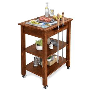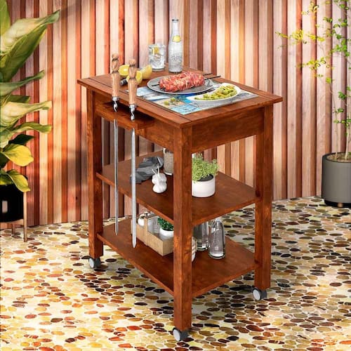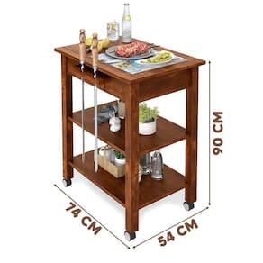 Apresentamos a Mesa Auxiliar para Churrasco com Rodinhas com Acabamento Natural, feita em madeira maciça para durabilidade. Seu acabamento com cera realça sua beleza. Com detalhes encantadores, como o tampo adornado com cerâmica, a mesa agrega charme ao ambiente. Além disso, possui suporte para espetos, gaveta para praticidade. Com ferragens em metal e rodízios para mobilidade, é uma combinação perfeita de elegância e funcionalidade.