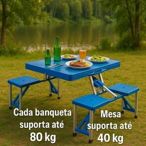 Mesa Azul Dobrável de Alumínio com 4 Banquinhos Para Camping Mesa Azul Dobrável de Alumínio com 4 Banquinhos Para Camping ===================================== Prática, funcional e perfeita para aventuras ao ar livre, é a escolha ideal para quem busca conforto e praticidade em momentos de lazer como campings, piqueniques, pescarias, praias ou viagens em família.