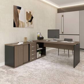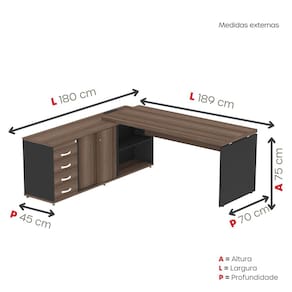 Com dimensões de 189x180cm, oferece amplo espaço para computador, documentos e acessórios de escritório, garantindo conforto durante o uso diário.