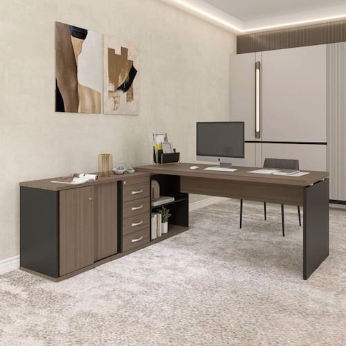 Equipada com 4 gavetas, proporciona excelente organização para materiais, pastas e itens pessoais, mantendo tudo sempre à mão.