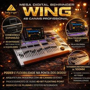 O Behringer WING é um mixer digital de 48 canais estéreo projetado para entregar performance extrema com operação intuitiva, atendendo desde grandes eventos até estúdios e produções profissionais. Ele combina um fluxo de trabalho moderno com recursos avançados de áudio, oferecendo controle absoluto sem complexidade desnecessária. O console conta com 24 faders motorizados de 100 mm, tela sensível ao toque capacitiva de 10, controles rotativos sensíveis ao toque e roda de navegação ajustável, proporcionando uma experiência de uso rápida, precisa e altamente visual. O áudio é captado com máxima fidelidade graças aos 8 pré-amplificadores MIDAS Pro, referência mundial em qualidade sonora. Um dos grandes diferenciais do WING é o conceito de Sources Fontes . Diferente dos mixers tradicionais, as entradas não são apenas canais físicos: cada Fonte carrega metadados completos como nome, cor, ícone, tags, ganho, power e modo de operação mono, estéreo ou mid-side . Isso permite uma organização extremamente eficiente mesmo com uma estrutura massiva de até 374 entradas e saídas físicas, chegando a 400 I/Os quando considerados os sinais internos. Cada um dos 48 canais 40 entradas + 8 retornos pode operar livremente em mono, estéreo ou mid-side, sem necessidade de linkar canais ou reiniciar o console. As mudanças de modo são feitas em tempo real, garantindo flexibilidade total durante a operação . Na conectividade, o WING é praticamente ilimitado: oferece AES50 SuperMAC, AES/EBU, StageCONNECT, USB 4848, MIDI, GPIO, Ethernet dupla e slot de expansão compatível com Dante, SoundGrid ou MADI via cartão opcional . Para gravação, permite capturar até 64 canais diretamente em cartões SD duplos ou via USB direto para DAWs. O processamento interno é extremamente robusto, com EQ paramétrico de até 6 bandas por canal, 8 bandas por barramento, processamento dinâmico completo, 16 processadores FX estéreo, além de slots de plugins variáveis. O WING também funciona como controlador DAW compatível com protocolos HUI e Mackie. Compacto para sua capacidade, o console mede 87 cm de largura, 57,4 cm de profundidade, 20 cm de altura e pesa 23 kg, sendo uma solução completa para quem exige potência, flexibilidade, qualidade sonora e fluxo de trabalho em um único equipamento.