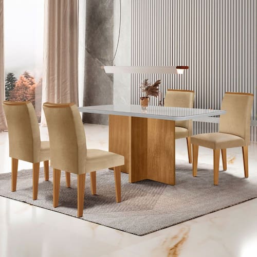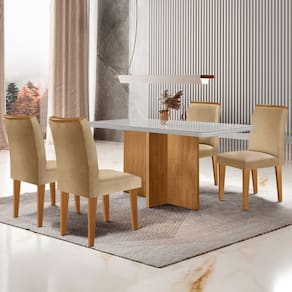 Características: Marca: Rufato Linha/Modelo: Mesa Berlim Tipo de produto: Mesa de jantar Quantidade de Lugares: 4 Formato da Mesa: Retangular Mesa 100 em MDF Possui Vidro: Sim Tampo com Vidro Temperado 4 MM Cadeiras com Pé em MDF Cadeira Estofada: Sim Encosto e Assento Estofados Revestido em Tecido de Alta Qualidade