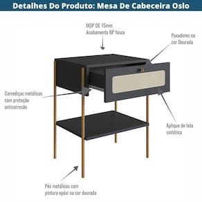 A Mesa de Cabeceira 1 Gaveta Oslo é confeccionada em MDP com acabamento BP, pés metálicos e aplique de tela sintética na gaveta. Móvel multifuncional, conta com uma gaveta para guardar acessórios, tornando o espaço mais organizado. Traz como característica um traço artesanal, suave e acolhedor. Com design escandinavo minimalista, remete em suas linhas retas a simplicidade, charme e funcionalidade que sua casa merece. Composta com uma paleta de cores neutras, Nero é um acabamento ebanizado atemporal, para quem deseja fugir do tradicional sem perder a nobreza, sofisticação e elegância da madeira, tornando-se assim a opção ideal para um ambiente com toque sofisticado e ao mesmo tempo aconchegante.