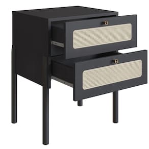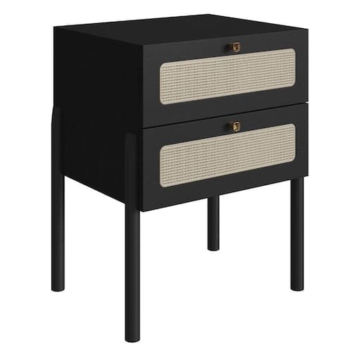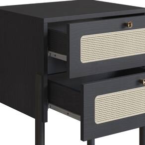 Mesa Cabeceira 2 Gavetas Oslo Artesano 48 Cm (larg) Mdp Nero Palha Sintética Bege Pé Madeira Maciça