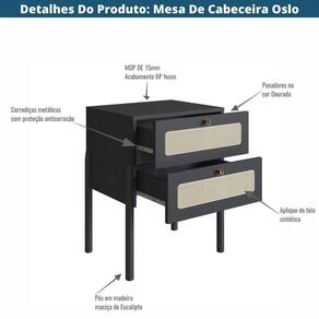 A Mesa de Cabeceira 2 Gavetas Oslo é confeccionada em MDP com acabamento BP, pés de madeira maciça e aplique de tela sintética nas gavetas. Móvel multifuncional, conta com duas gavetas para guardar acessórios, tornando o espaço mais organizado. Traz como característica um traço artesanal, suave e acolhedor. Com design escandinavo minimalista, remete em suas linhas retas a simplicidade, charme e funcionalidade que sua casa merece. Composta com uma paleta de cores neutras, Nero é um acabamento ebanizado atemporal, para quem deseja fugir do tradicional sem perder a nobreza, sofisticação e elegância da madeira, tornando-se assim a opção ideal para um ambiente com toque sofisticado e ao mesmo tempo aconchegante.
