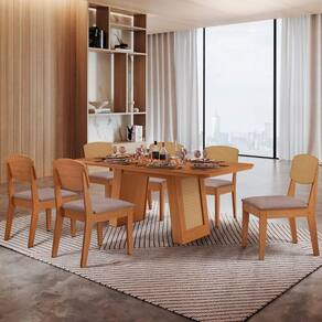 Mesa Carolina 180 Tampo Mdf 6 Cadeiras Moderna Mobilia Linho Capuccino / Naturalle/naturalle/pa O conjunto formado pela Cadeira Copper Premium e a Mesa Carolina e a combinacao perfeita de sofisticacao, conforto e design contemporaneo. A Mesa Carolina, com tampo laminado de 180 cm, complementa o conjunto com estilo e praticidade. Seu diferencial esta na base com detalhes que imitam rattan. ja as cadeiras se destacam pelo encosto em MDF moldado, que oferece suporte ergonomico ideal, alem do estofado macio que garante o maximo conforto. Seu acabamento refinado e os detalhes no encosto que imitam rattan, criando uma harmonia visual com as cadeiras e adicionando um toque de charme natural ao espaco. Caracteristicas: Marca: Moderna Mobilia Modelo: Copper Premium Material: MDF