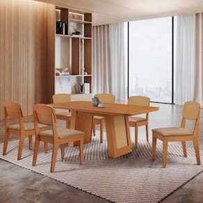 Mesa Carolina 180 Tampo Mdf 6 Cadeiras Moderna Mobilia Turim 07 / Naturalle/naturalle/palha O conjunto formado pela Cadeira Copper Premium e a Mesa Carolina e a combinacao perfeita de sofisticacao, conforto e design contemporaneo. A Mesa Carolina, com tampo laminado de 180 cm, complementa o conjunto com estilo e praticidade. Seu diferencial esta na base com detalhes que imitam rattan. ja as cadeiras se destacam pelo encosto em MDF moldado, que oferece suporte ergonomico ideal, alem do estofado macio que garante o maximo conforto. Seu acabamento refinado e os detalhes no encosto que imitam rattan, criando uma harmonia visual com as cadeiras e adicionando um toque de charme natural ao espaco. Caracteristicas: Marca: Moderna Mobilia Modelo: Copper Premium Material: MDF