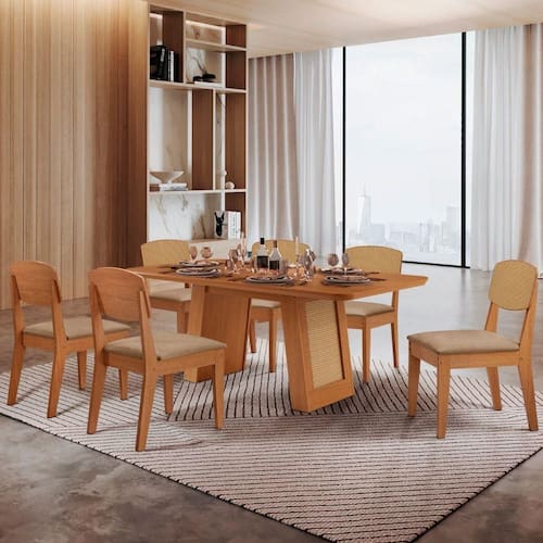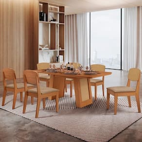 ja as cadeiras se destacam pelo encosto em MDF moldado, que oferece suporte ergonomico ideal, alem do estofado macio que garante o maximo conforto. Seu acabamento refinado e os detalhes no encosto que imitam rattan, criando uma harmonia visual com as cadeiras e adicionando um toque de charme natural ao espaco.