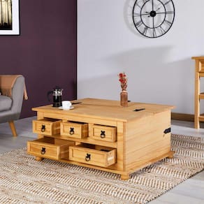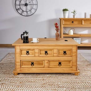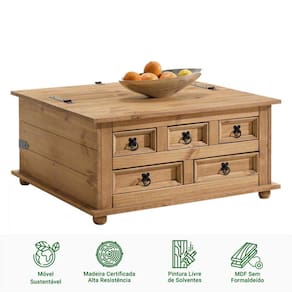 Além das gavetas funcionais, essa mesa de centro também conta com um espaçoso baú, perfeito para armazenar livros, revistas, mantas ou qualquer outro item que você queira manter à mão, mantendo sua sala de estar organizada e livre de bagunça. Os puxadores coloniais adicionam um toque clássico e elegante ao design.