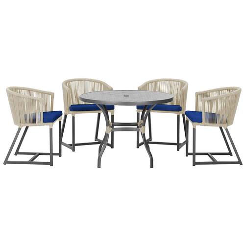 Descubra a Elegância e Durabilidade da Mesa de Jantar Roma e Cadeiras Noronha. Combinando estilo e resistência, esta Mesa e cadeiras traz o melhor do design contemporâneo em alumínio com micro pintura e acabamento em corda náutica. O estofado impermeável completa o conforto e a funcionalidade, tornando-a ideal para ambientes externos e internos.