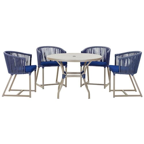 Descubra a Elegancia e Durabilidade da Mesa de Jantar Roma e Cadeiras Noronha. Combinando estilo e resistencia, esta Mesa e cadeiras traz o melhor do design contemporaneo em aluminio com micro pintura e acabamento em corda nautica. O estofado impermeavel completa o conforto e a funcionalidade, tornando-a ideal para ambientes externos e internos.