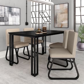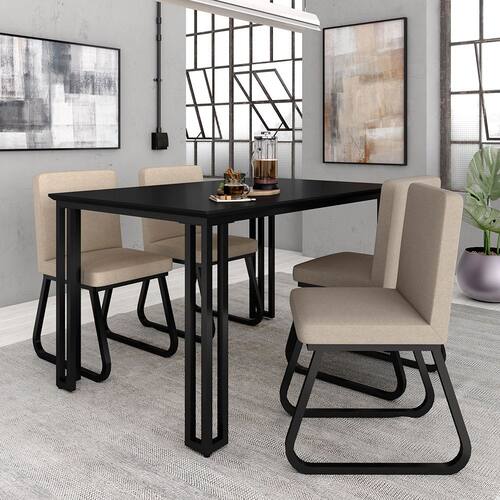 O Conjunto Sala de Jantar Deli possui um design industrial e sofisticado, ideal para dar aquele toque único e aconchegante em seu ambiente!Detalhes Técnicos da Mesa:- Acabamento da Mesa: Pintura Texturizada- Tipo de Pintura: UV Texturizada- Quantidade de Lugares: 04- Estrutura da Mesa: Metálica- Tonalidade da Estrutura da Mesa: Preto Fosco- Material do Tampo: MDF de 25mm- Medida da Mesa Montada: A:76cm | L:136cm | P:90cm- Tonalidade do Tampo: Preto FoscoDetalhes Técnicos das Cadeiras:- Acabamento da Cadeira: Assento e Encosto Estofados- Almofada do Assento: Fixa- Cadeira Estofada: Sim- Peso Suportado da Cadeira: 90KG- Facilidade da Montagem: Média- Tonalidade da estrutura da Cadeira: Preto Fosco- Tonalidade do Tecido: Linho Bege- Tipo de Pintura: UV Texturizada- Material da Estrutura: Metálica- Medida de cada Cadeira: A:86cm | L:44cm | P:56,5cmConteúdo da Embalagem:- 01 Mesa- 04 Cadeiras- Manual de Montagem- Acessório para MontagemObservações Importantes:- As imagens ambientadas são meramente ilustrativas e podem apresentar itens que não incorporam o produto;- Todos os nossos produtos são novos, acompanham documento fiscal e possuem garantia de 3 meses, essa garantia cobre somente defeitos de fabricação;- A entrega só será efetuada no endereço do CEP, caso o endereço seja diferente do CEP informado no pedido, a entrega terá cobrança adicional e o comprador arcará com as despesas;- Não realizamos entregas para zonas rurais, via caminhos fluviais e distritos, por isso não aceitamos CEP GERAL da região;- Não é possível realizar o agendamento de entrega do produto, é necessário que acompanhe o rastreio de seu pedido para saber a previsão de entrega;- As entregas somente serão realizadas para um responsável maior de idade (+18);- Enviamos para diversos estados, sendo assim nossas entregas são realizadas por transportadoras parceiras de nossa empresa. Confira as dimensões antes da compra e certifique-se de que o produto passará por elevadores, portas e corredores já que nossa entrega não inclui a subida de lances de escada, transporte por elevador e o lançamento de produtos, em caso de condomínios residenciais a entrega é feita somente até a portaria. Todas as entregas são realizadas em dias e horários comerciais;- Ao receber os seus produtos observe se a embalagem se encontra em perfeitas condições. Se você adquiriu algum móvel, confira atentamente a quantidade de volumes e o aspecto físico das embalagens. Confira também se a cor do móvel está de acordo com o seu pedido;- O prazo de cancelamento por arrependimento é de até 7 dias corridos a contar da data de recebimento;- Os produtos e assistências são enviados DESMONTADOS, MONTAGENS E DESMONTAGENS recomendamos sempre a contratação de um montador profissional e é válido lembrar que o custo desses serviços é por conta do comprador;- Objetos decorativos que aparecem na foto não acompanham o produto;- Evitar a exposição direta à luz solar e à umidade;- Para limpeza, limpar com pano macio e seco, não utilizar qualquer outro tipo de produtos químicos;- As cores do produto podem variar de acordo com o monitor, a iluminação do ambiente ou sua percepção visual;
