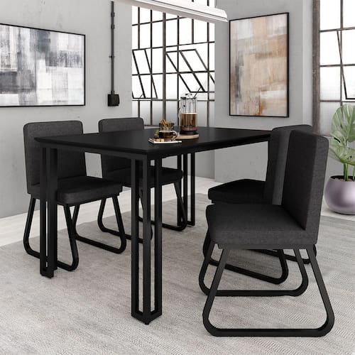 O Conjunto Sala de Jantar Deli possui um design industrial e sofisticado, ideal para dar aquele toque único e aconchegante em seu ambiente!Detalhes Técnicos da Mesa:- Acabamento da Mesa: Pintura Texturizada- Tipo de Pintura: UV Texturizada- Quantidade de Lugares: 04- Estrutura da Mesa: Metálica- Tonalidade da Estrutura da Mesa: Preto Fosco- Material do Tampo: MDF de 25mm- Medida da Mesa Montada: A:76cm | L:136cm | P:90cm- Tonalidade do Tampo: Preto FoscoDetalhes Técnicos das Cadeiras:- Acabamento da Cadeira: Assento e Encosto Estofados- Almofada do Assento: Fixa- Cadeira Estofada: Sim- Peso Suportado da Cadeira: 90KG- Facilidade da Montagem: Média- Tonalidade da estrutura da Cadeira: Preto Fosco- Tonalidade do Tecido: Linho Grafite- Tipo de Pintura: UV Texturizada- Material da Estrutura: Metálica- Medida de cada Cadeira: A:86cm | L:44cm | P:56,5cmConteúdo da Embalagem:- 01 Mesa- 04 Cadeiras- Manual de Montagem- Acessório para MontagemObservações Importantes:- As imagens ambientadas são meramente ilustrativas e podem apresentar itens que não incorporam o produto;- Todos os nossos produtos são novos, acompanham documento fiscal e possuem garantia de 3 meses, essa garantia cobre somente defeitos de fabricação;- A entrega só será efetuada no endereço do CEP, caso o endereço seja diferente do CEP informado no pedido, a entrega terá cobrança adicional e o comprador arcará com as despesas;- Não realizamos entregas para zonas rurais, via caminhos fluviais e distritos, por isso não aceitamos CEP GERAL da região;- Não é possível realizar o agendamento de entrega do produto, é necessário que acompanhe o rastreio de seu pedido para saber a previsão de entrega;- As entregas somente serão realizadas para um responsável maior de idade (+18);- Enviamos para diversos estados, sendo assim nossas entregas são realizadas por transportadoras parceiras de nossa empresa. Confira as dimensões antes da compra e certifique-se de que o produto passará por elevadores, portas e corredores já que nossa entrega não inclui a subida de lances de escada, transporte por elevador e o lançamento de produtos, em caso de condomínios residenciais a entrega é feita somente até a portaria. Todas as entregas são realizadas em dias e horários comerciais;- Ao receber os seus produtos observe se a embalagem se encontra em perfeitas condições. Se você adquiriu algum móvel, confira atentamente a quantidade de volumes e o aspecto físico das embalagens. Confira também se a cor do móvel está de acordo com o seu pedido;- O prazo de cancelamento por arrependimento é de até 7 dias corridos a contar da data de recebimento;- Os produtos e assistências são enviados DESMONTADOS, MONTAGENS E DESMONTAGENS recomendamos sempre a contratação de um montador profissional e é válido lembrar que o custo desses serviços é por conta do comprador;- Objetos decorativos que aparecem na foto não acompanham o produto;- Evitar a exposição direta à luz solar e à umidade;- Para limpeza, limpar com pano macio e seco, não utilizar qualquer outro tipo de produtos químicos;- As cores do produto podem variar de acordo com o monitor, a iluminação do ambiente ou sua percepção visual;