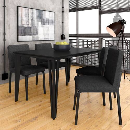 O Conjunto Sala de Jantar Denver com 4 Cadeiras com um design industrial e moderno, perfeito para dar aquele toque convidativo e atraente em seu ambiente!Detalhes Técnicos da Mesa- Pintura UV- Estrutura: Metálica- Tonalidade Mesa: Preto Fosco- Material Tampo: MDF de 25mm- Medida Montada: A:76cm | L:136cm | P:90cmDetalhes Técnicos das Cadeiras- Acabamento: Assento e Encosto Estofados- Almofada Assento: Fixa- Espuma Assento: D16- Espuma Encosto: D14- Cadeira suporta até 90KG- Facilidade Montagem: Média- Tonalidade Cadeiras: Preto Fosco/Linho Grafite- Material Estrutura: Metálica- Medida de cada Cadeira: A:86cm | L:44cm | P:54cmConteúdo da Embalagem- Mesa + 04 Cadeiras- Manual de Montagem- Acessórios para MontagemObservações Importantes- As imagens ambientadas são meramente ilustrativas e podem apresentar itens que não incorporam o produto;- Todos os nossos produtos são novos, acompanham documento fiscal e possuem garantia de 3 meses, essa garantia cobre somente defeitos de fabricação;- A entrega só será efetuada no endereço do CEP, caso o endereço seja diferente do CEP informado no pedido, a entrega terá cobrança adicional e o comprador arcará com as despesas;- Não realizamos entregas para zonas rurais, via caminhos fluviais e distritos, por isso não aceitamos CEP GERAL da região;- Não é possível realizar o agendamento de entrega do produto, é necessário que acompanhe o rastreio de seu pedido para saber a previsão de entrega;- As entregas somente serão realizadas para um responsável maior de idade (+18);- Enviamos para diversos estados, sendo assim nossas entregas são realizadas por transportadoras parceiras de nossa empresa. Confira as dimensões antes da compra e certifique-se de que o produto passará por elevadores, portas e corredores já que nossa entrega não inclui a subida de lances de escada, transporte por elevador e o lançamento de produtos, em caso de condomínios residenciais a entrega é feita somente até a portaria. Todas as entregas são realizadas em dias e horários comerciais;- Ao receber os seus produtos observe se a embalagem se encontra em perfeitas condições. Se você adquiriu algum móvel, confira atentamente a quantidade de volumes e o aspecto físico das embalagens. Confira também se a cor do móvel está de acordo com o seu pedido;- O prazo de cancelamento por arrependimento é de até 7 dias corridos a contar da data de recebimento;- Os produtos e assistências são enviados DESMONTADOS, MONTAGENS E DESMONTAGENS recomendamos sempre a contratação de um montador profissional e é válido lembrar que o custo desses serviços é por conta do comprador;- Objetos decorativos que aparecem na foto não acompanham o produto;- Evitar a exposição direta à luz solar e à umidade;- Para limpeza, limpar com pano macio e seco, não utilizar qualquer outro tipo de produtos químicos;- As cores do produto podem variar de acordo com o monitor, a iluminação do ambiente ou sua percepção visual;