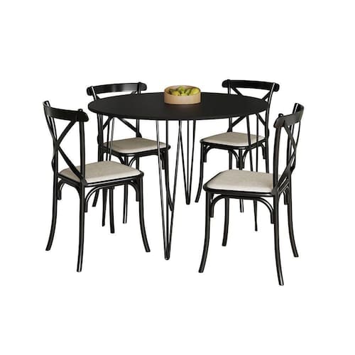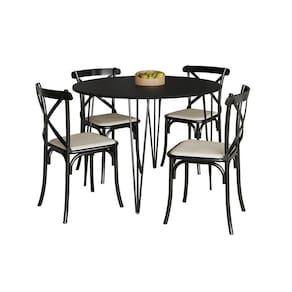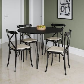 Mesa Com 4 Cadeiras Katrina Preta Elen Hairpin 110cm Jantar Preta Com Ferro PretoA sua cozinha ou sala de jantar só está completa com uma boa combinação de mesa e cadeira para reunir a família e amigos, se você busca um móvel de qualidade e com combinação de cores, o modelo Elen e Katrina é para você! Com tampo redondo e estrutura em ferro, ela acomoda os seus convidados enquanto complementa a decoração com sofisticação e qualidade.Tipo: ConjuntoModelo: Elen e KatrinaCor Tampo: PretoBase: PretoMedidas MesaAltura: 76cmDiâmetro: 110cmMedidas Cadeira:Altura: 90cmLargura: 48cmComprimento: 46cmATENÇÃOIMAGENS MERAMENTE ILUSTRATIVAS, PODENDO HAVER UMA PEQUENA VARIAÇÃO DE COR DEPENDENDO DE CADA TELA OU MONITOR. Mesa com 4 Cadeiras Katrina Preta Elen Hairpin 110cm Jantar Preta com Ferro Preto