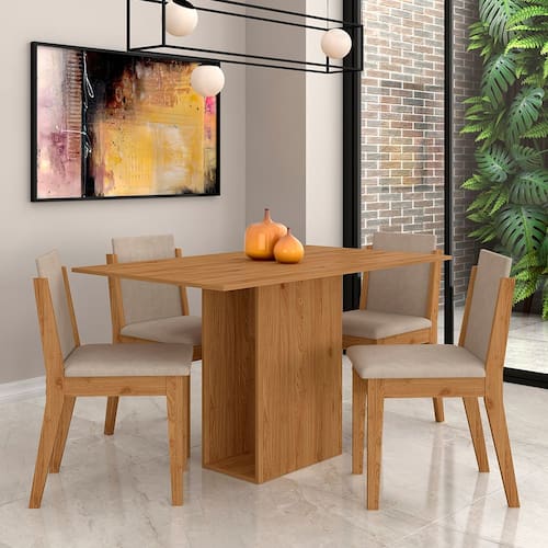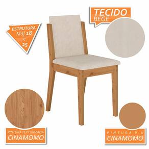 O Conjunto Sala de Jantar Samoa 4 Cadeiras Oslo é sofisticada tornando seu ambiente mais agradável.Detalhes Técnicos da Mesa:- Acabamento da Mesa: Pintura Texturizada- Tipo de Pintura: UV Texturizada - P.U- Borda da Mesa: P.U- Quantidade de Lugares: 04- Material da Base da Mesa: MDP- Material do Tampo: MDP- Tipo de Tampo: Retangular MDP Pintura Texturizada-Tonalidade da Mesa: Cinamomo- Espessura do Tampo:15 mm- Medida da Base: 78CM x 70CM x 35CM- Medida do Tampo: 104CM x 68CM x 15CM- Medida da Mesa Montada: (A x C x P) 80CM x 104CM x 68CM- Possui Suporte Giratório: Não- Formato: Retangular- Garantia do Fornecedor: 3 MesesDetalhes Técnicos das Cadeiras:- Acabamento da Cadeira: Pintura com Assento Estofado- Almofada do Assento: Fixa- Cadeira Estofada: Sim (Assento)- Peso Suportado da Cadeira: 90 KG- Facilidade da Montagem: Média- Deve ser montada por um Profissional- Tonalidade: Cinamomo (Estrutura)/ Suede Bege (Assento e Encosto)- Espuma do Assento: D 23- Tipo de Pintura: UV Texturizada- Material da Estrutura: 100% MDF 25 e 18 mm- Revestimento da Cadeira: Suede- Medida da Cadeira/ Banco: 95CM x 40CM x 45CMConteúdo da Embalagem:- 01 Sala de Jantar- Manual de Montagem- Acessório para MontagemObservações Importantes:- Evitar a exposição direta à luz solar e à umidade;- Para limpeza, limpar com pano macio e seco, não utilizar qualquer outro tipo de produtos químicos;- As imagens ambientadas são meramente ilustrativas e podem apresentar itens que não incorporam o produto;- Objetos decorativos que aparecem na foto não acompanham o produto;- As cores do produto podem variar de acordo com o monitor, a iluminação do ambiente ou sua percepção visual;PERGUNTAS FREQUENTES1 - O produto é novo ou usado?R.: Todos os nossos produtos são novos e acompanham NOTA FISCAL.2 – O produto vem montado? Vocês realizam a montagem?R.: - Os móveis são entregues desmontados e com manual de montagem. MONTAGENS, DESMONTAGENS e INSTALAÇÕES devem ser contratado um montador profissional pelo CLIENTE.3 – Os produtos possuem garantia?R.: Sim, todos os nossos produtos possuem garantia de 3 meses, essa garantia cobre somente defeitos de fabricação. Esta garantia não cobre defeitos por uso inadequado ou abusivo, falta de cuidados e desbotamento natural dos revestimentos.4 – Como é realizada a entrega?R.: Enviamos para diversos estados, sendo assim nossas entregas são realizadas por transportadoras parceiras de nossa empresa. Confira as dimensões antes da compra e certifique-se de que o produto passará por elevadores, portas e corredores já que nossa entrega não inclui a subida de lances de escada, transporte por elevador e o lançamento de produtos, em caso de condomínios residenciais a entrega é feita somente até a portaria. Todas as entregas são realizadas em dias e horários comerciais.5 – O que devo verificar no ato da entrega do produto?R.: Observe se a embalagem se encontra em perfeitas condições. Se você adquiriu algum móvel, confira atentamente a quantidade de volumes e o aspecto físico das embalagens. Confira também se a cor do móvel está de acordo com o seu pedido.6 – Vocês entregam para todo o país?R.: Para verificar se enviamos à sua região, basta ir ao campo de cálculo de entrega e colocar seu CEP assim é possível visualizar se entregamos, o valor e o prazo para o transporte até a sua cidade!7 – Quando houver necessidade de desmontagens para efetuar a troca ou devolução, os custos de tais serviços serão ressarcidos?R.: Não, os custos de DESMONTAGENS sempre serão por conta do CLIENTE!.