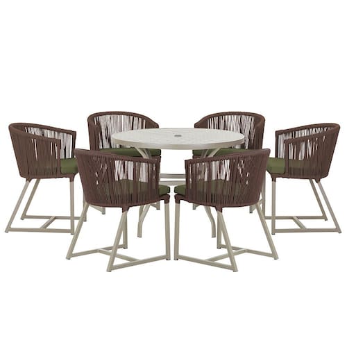 Combinando estilo e resistência, esta Mesa e cadeiras traz o melhor do design contemporâneo em alumínio com micro pintura e acabamento em corda náutica. O Estofado impermeável completa o conforto e a funcionalidade, tornando-a ideal para ambientes externos e internos.