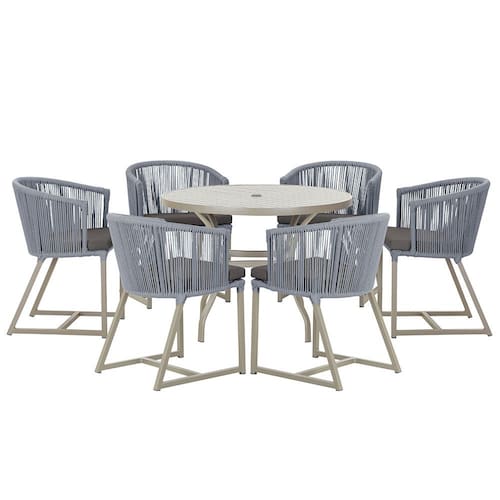 Combinando estilo e resistência, esta Mesa e cadeiras traz o melhor do design contemporâneo em alumínio com micro pintura e acabamento em corda náutica. O Estofado impermeável completa o conforto e a funcionalidade, tornando-a ideal para ambientes externos e internos.