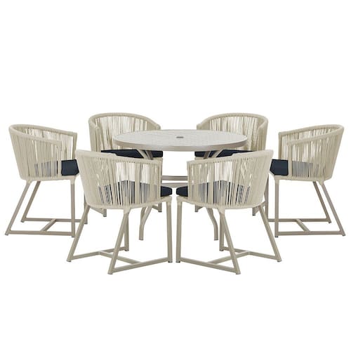 Combinando estilo e resistência, esta Mesa e cadeiras traz o melhor do design contemporâneo em alumínio com micro pintura e acabamento em corda náutica. O Estofado impermeável completa o conforto e a funcionalidade, tornando-a ideal para ambientes externos e internos.