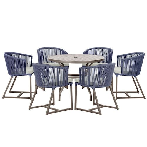 Combinando estilo e resistencia, esta Mesa e cadeiras traz o melhor do design contemporaneo em aluminio com micro pintura e acabamento em corda nautica. O Estofado impermeavel completa o conforto e a funcionalidade, tornando-a ideal para ambientes externos e internos.