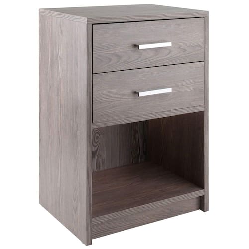 - Um acabamento cinza suave adiciona um toque rústico ao estilo simples e contemporâneo da mesa Molina. Com duas gavetas e grande armário aberto, há muito espaço para armazenamento no quarto como uma mesa lateral, na sala de estar ou covil escondido ao lado do sofá, ou até mesmo em um escritório em casa para armazenamento de papel e uso como suporte de impressora. Feito de madeira composta durável com puxadores modernos de plástico de prata fosco.