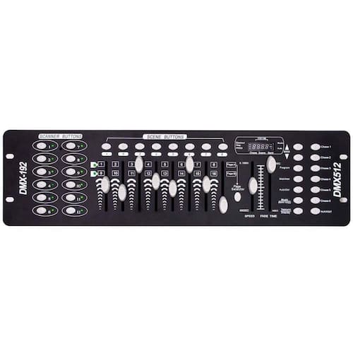Mesa Controladora Dmx-512 Iluminação E Efeitos Portátil 192 Canais Se esta a procura de um evento ou festa inesquecível com a Mesa Controladora Dmx-512 Iluminação e Efeitos 192 Canais Portátil isso jáé possível . Um equipamento moderno, prático, leve e portátil que permite realizar efeitos de iluminação de modo e diferenciado de forma fácil e rápida.Pode ser utilizada em eventos todos os portes, possibilitando controlar e sincronizar todos os fixtures como Movings Heads, Strobos, Par Leds, Máquinas de Fumaça, Raio de Sol e Lasers em um único aparelho.Assim, a Mesa para Controle de Iluminação Portátil pode ser utilizada em eventos todos os portes, possibilitando controlar e sincronizar todos os fixtures como Movings Heads, Strobos, Par Leds, Máquinas de Fumaça, Raio de Sol e Lasers em um único aparelho.Principais Características: 192 Canais DMX; Controla até 12 aparelhos com 16 canais cada simultaneamente; Memória para 30 programas com 8 cenas cada 240 cenas no total ; Controla aparelhos com até 16 canais DMX É possível gravar 8 cenas diferentes na configuração Função Blackout Fonte Bivolt 110-220V Inclusa Marca: Não Informado Ean: 0781462202880