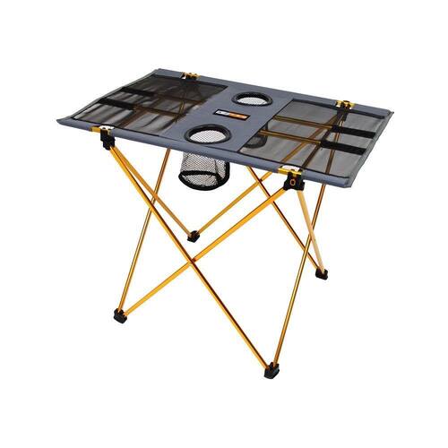 Compacta e de fácil de montagem, este modelo torna-se ideal para quem procura uma mesa prática e que seja leve em suas aventuras. Seu tampo em poliéster de alta resistência com dois portas copos, assegura os produtos fiquem bem armazenados e seguros. O sistema de montagem por meio de tubos circulares de duralumínio é inovador e exclusivo no mercado. Informações gerais: Material: Poliéster de alta resitência e estrutura de duralumínio Medidas: 56 x 48cm Peso: 775g