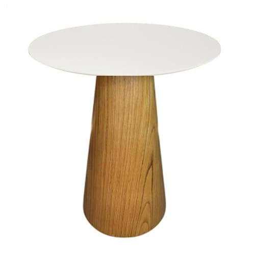 Base Cone feita em Fiberglass Laminada em Madeira Freijó com a altura de 70 cm. Possui sapatas plásticas, Tampo com o diâmetro de 70 cm em MDF Laqueado Off White.