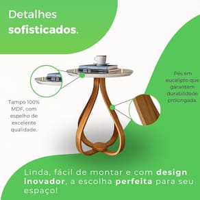 Essa mesa lateral une funcionalidade e sofisticação com seu tampo em MDF revestido com espelho, que adiciona brilho e modernidade ao design. Os pés em eucalipto, com acabamento natural, proporcionam um toque orgânico e acolhedor. Compacta e versátil, é perfeita para complementar diferentes ambientes, servindo como apoio para objetos decorativos ou itens do dia a dia. Uma peça que combina durabilidade e elegância de forma harmoniosa.